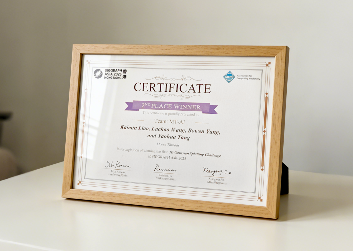 12月17日,在香港举办的全球图形学领域备受瞩目的顶级学术盛会 SIGGRAPH Asia 2025上,摩尔线程在3D Gaussian Splatting Reconstruction Challenge(3DGS 重建挑战赛)中凭借自研技术LiteGS出色的算法实力和软硬件协同优化能力,斩获银奖,再次证明摩尔线程在新一代图形渲染技术上的深度积累与全球学术界的高度认可。