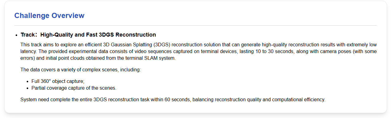 本次竞赛为参赛团队设置了极具挑战性的任务:参赛者需在60秒内,基于主办方提供的真实终端视频序列(10–30秒)、存在误差的相机轨迹以及终端SLAM点云,在极短时间内完成完整的3DGS高质量重建。
