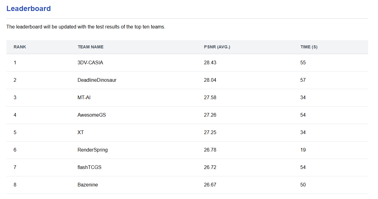 目前3D Gaussian Splatting Reconstruction Challenge(3DGS重建挑战赛)的结果及数据集已向全球公开,相关资料可在SIGGRAPH Asia官方网站获取:
