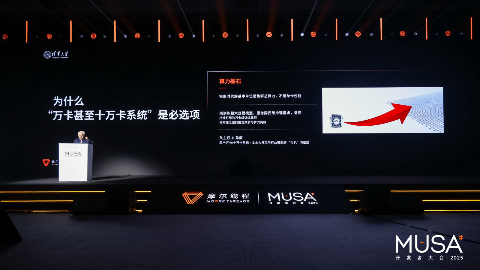中国工程院院士、清华大学计算机系教授郑纬民发表主题演讲。他指出,发展“主权AI”是提升未来国家竞争力的关键,其核心在于实现“算力自主、算法自强、生态自立”的完整体系。郑院士认为,国产计算显卡与国外主流产品的性能差距正在持续缩小,虽然构建国产万卡乃至十万卡级别的超大规模智算系统存在难度,但这是必须完成的产业基础设施任务。他特别指出,开发者是生态建设的关键,国产芯片平台必须构建起友好、易用的开发环境,以有效服务开发者社群。