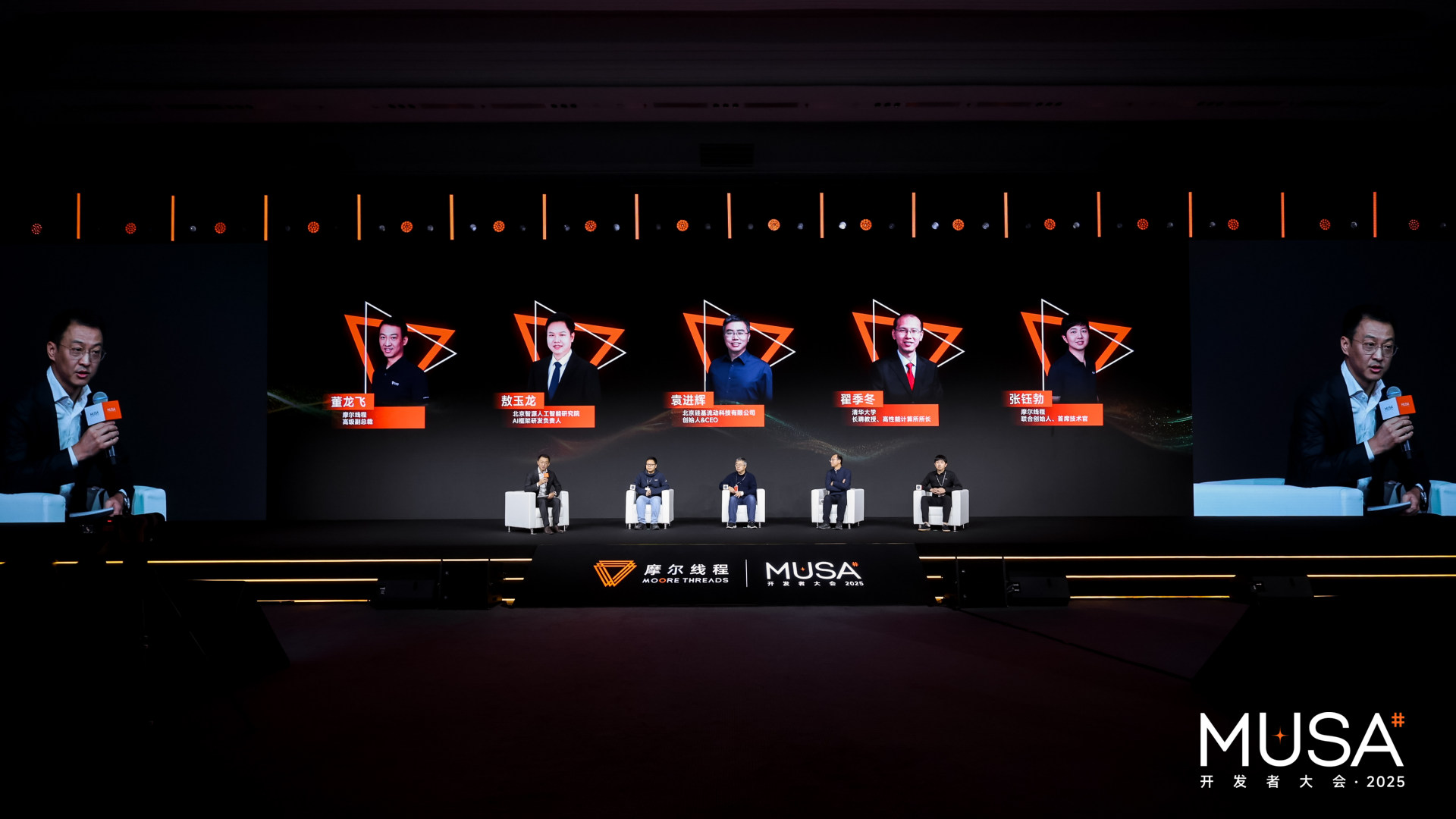 主论坛圆桌对话环节,一场围绕“国产 AI 算力生态的‘破’与‘立’”的思想交锋热烈展开。本环节特邀硅基流动创始人兼CEO袁进辉,清华大学长聘教授、高性能计算所所长翟季冬,智源研究院AI框架团队研发负责人敖玉龙,摩尔线程联合创始人兼CTO张钰勃,摩尔线程高级副总裁董龙飞共聚一堂,围绕算力损耗、兼容性与极致性能的平衡等核心议题展开讨论。会议形成共识:中国AI生态建设的核心在于凝聚产业共识,坚定走软硬协同的产业链打通之路。摩尔线程通过持续迭代MUSA架构、拥抱开源和开设摩尔学院等行动,正积极推动这一协同生态的建设。