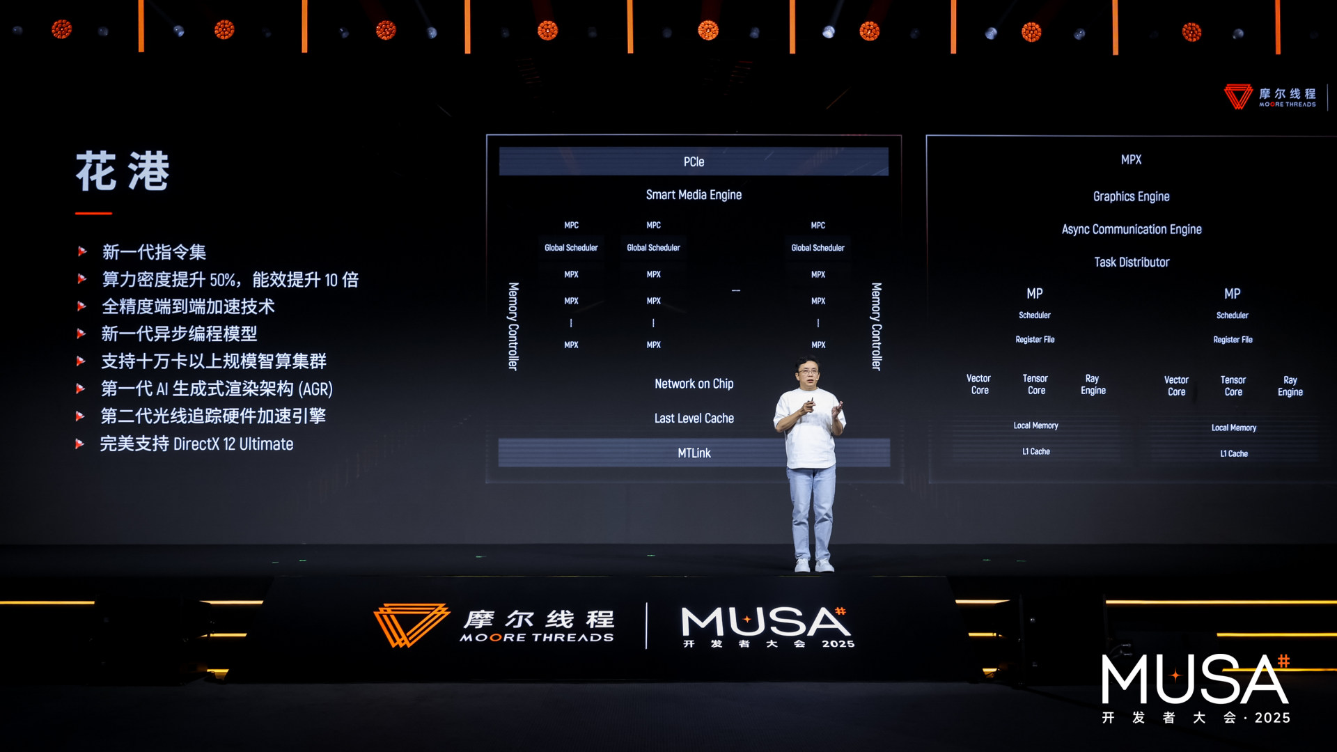 发布全功能GPU架构“花港”,支持FP4到FP64的全精度计算,密度提升50%,效能提升10倍。未来将基于该架构推出高性能AI训推一体“华山”芯片与专攻高性能图形渲染的“庐山”芯片。