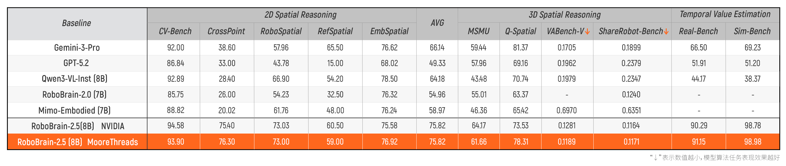 为了检验模型算法效果,智源团队在 2D/3D空间感知推理榜单、时序价值评估榜单等多个权威具身评测数据集上进行了验证。结果显示,基于MTT S5000国产千卡训练出的RoboBrain-2.5模型,在多项关键指标上均与国际主流GPU训练模型保持一致。特别是在CrossPoint、Q-Spatial、VABench-V任务上,算法效果表现更优。这种全面对齐的评测结果,表明FlagOS-Robo框架与MTT S5000算力协同训练出的“具身大脑”,在理解、规划和执行能力上已达行业一流水准。